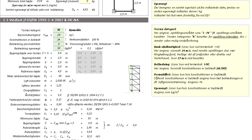 After an extensive period of development, input validation, tests, structuring and verification of calculations, a simple spreadsheet now allows them to test planned setups and document the static data. The delivered spreadsheet includes dynamic update of drawings and figures and most essential Eurocode compliant calculations, including all basic checks of the structures stability, all in accordance with the Danish national annexes.